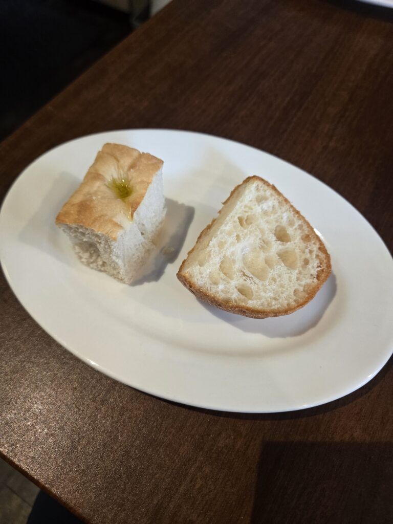 このパンがお代わり自由です。左のほうがうっすらオリーブオイルかけてあって塩もふりかけてあって美味しかったです。毎回焼いて持ってきてくださるのでカリカリで美味しい。結婚式とかでもこの手のパンお代わり自由あるんですけど大好きなんですよね。焼いてくれるのもありがたい。