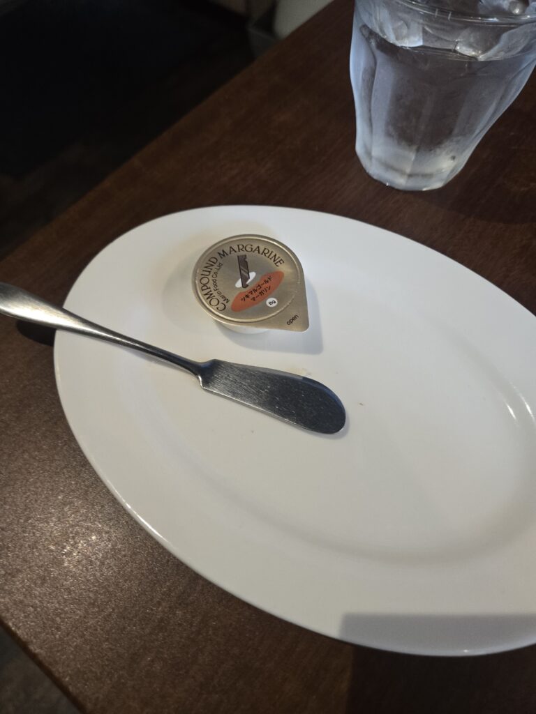 このパスタも美味しかったんですが、なんとパンおわかりし放題なのはすでに知ってたんですがマーガリンもいただけることがわかりました。
