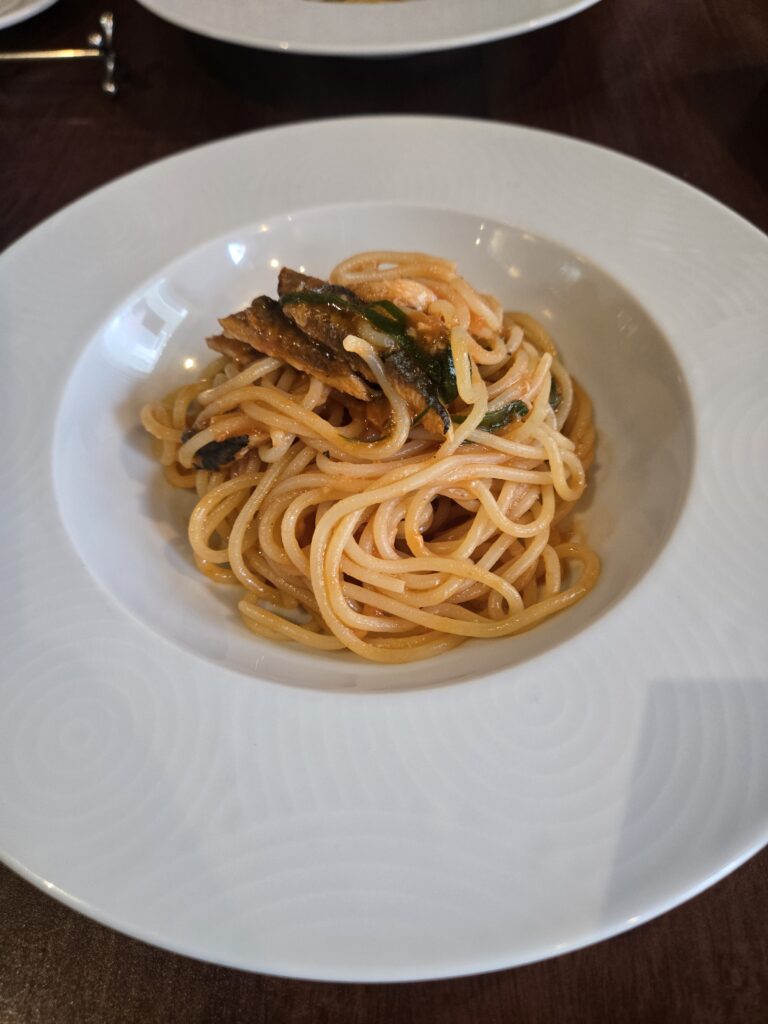メインのパスタです。麺がもちもちしてて美味しかったです。もちろん残ったソースでパンお代わりして食べました。