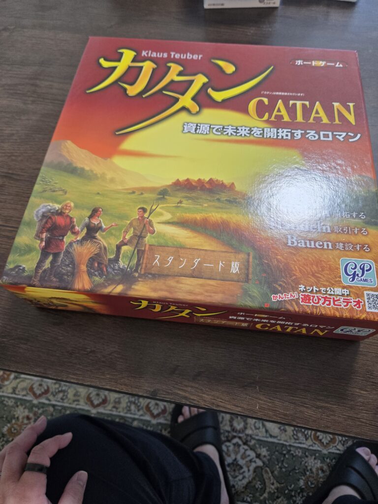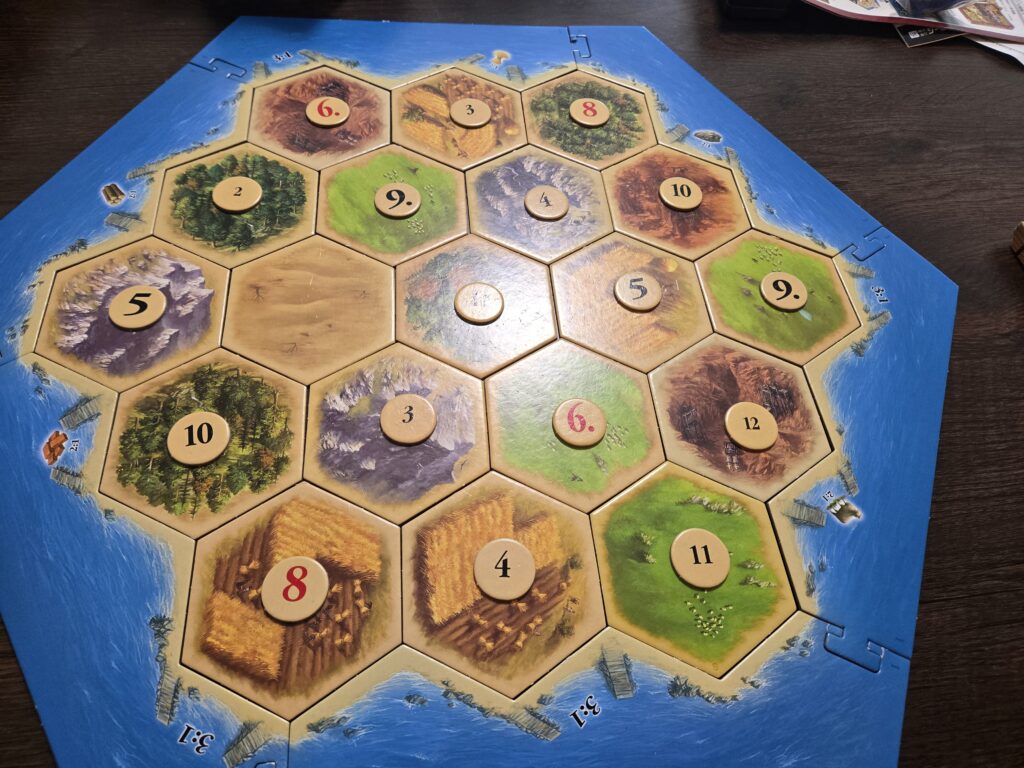 カタン島って架空の島を開拓するってテーマのボードゲームです。島を開拓するには、資源となる、木、レンガ、麦、羊、鉄を集めます。その資源を使って、道、開拓地、都市を作って行く。ざっくりこんな感じです。