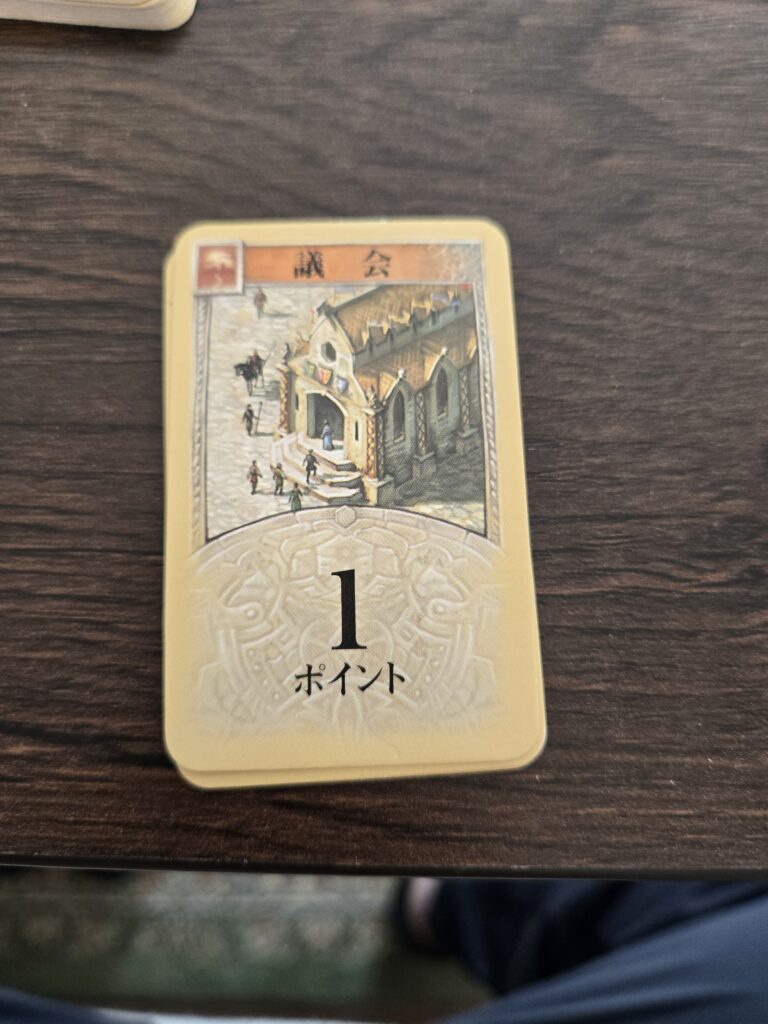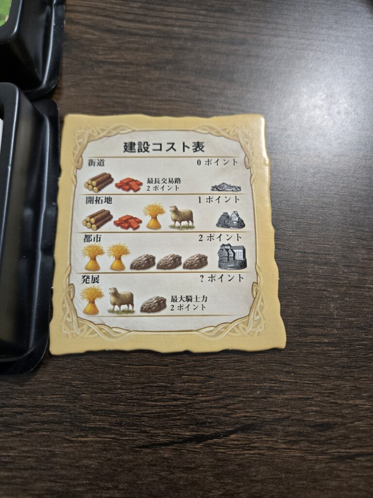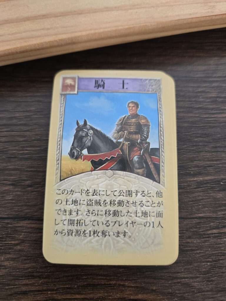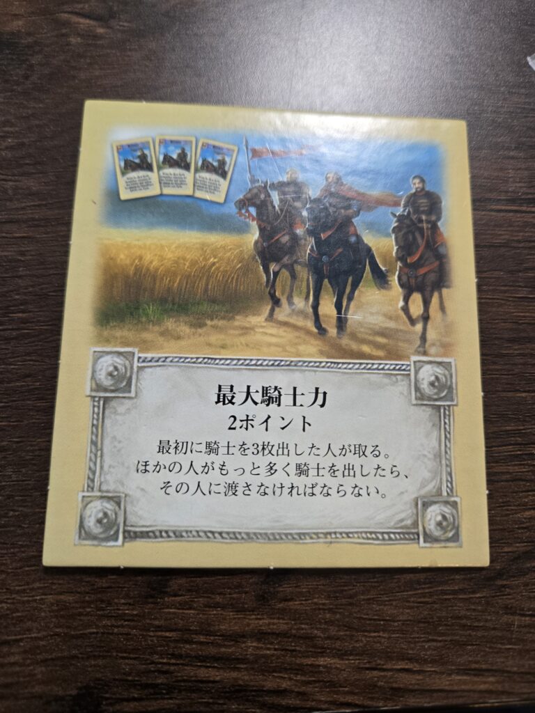 資源を消費することで発展カード(以降ガチャと呼ぶ)を引けるのですが、その中にある騎士ってカードを3枚使えば獲得できます。獲得できると2ポイントです。一回取得したら他の人に騎士の数が追い越されるまで保持できます。(騎士が同数の場合は、元から保持してる人の手元にあるままです)