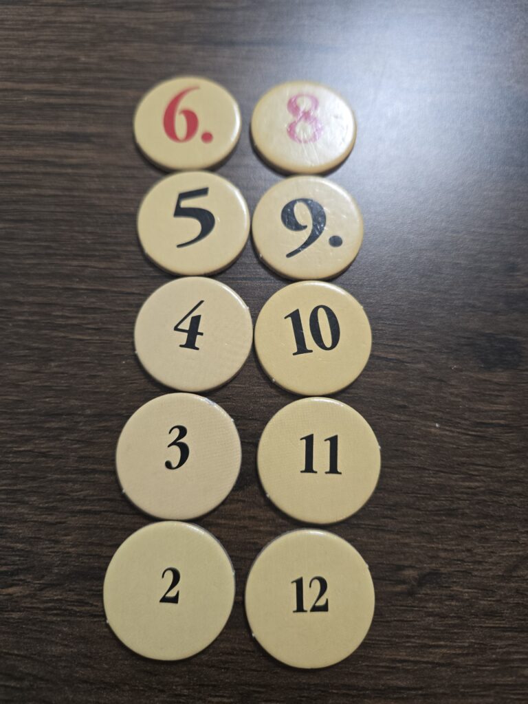 ダイスを2個降って出る出目の確率は7が一番高いんですが、7は特別な処理があるのでいったん抜きにして各タイルに並ぶ数字はこれらです。出目が出る確率が高い=資源獲得の確率が高いので強い数字になります。6と8が強くて、そこから下に下がるほど弱くなっていきます。