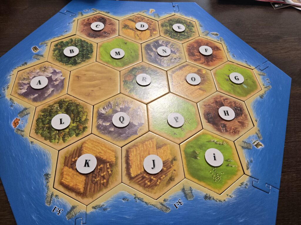 タイルは適当に配置して、数字チップの置き方はいくつかあるんですが自分はこんな感じに真ん中の端をAにしてそこから真ん中に向かって進む形で配置してます。このとき「エービーシーディー♪」みたいに歌いながらやって他の人に置くのを手伝ってもらってます。