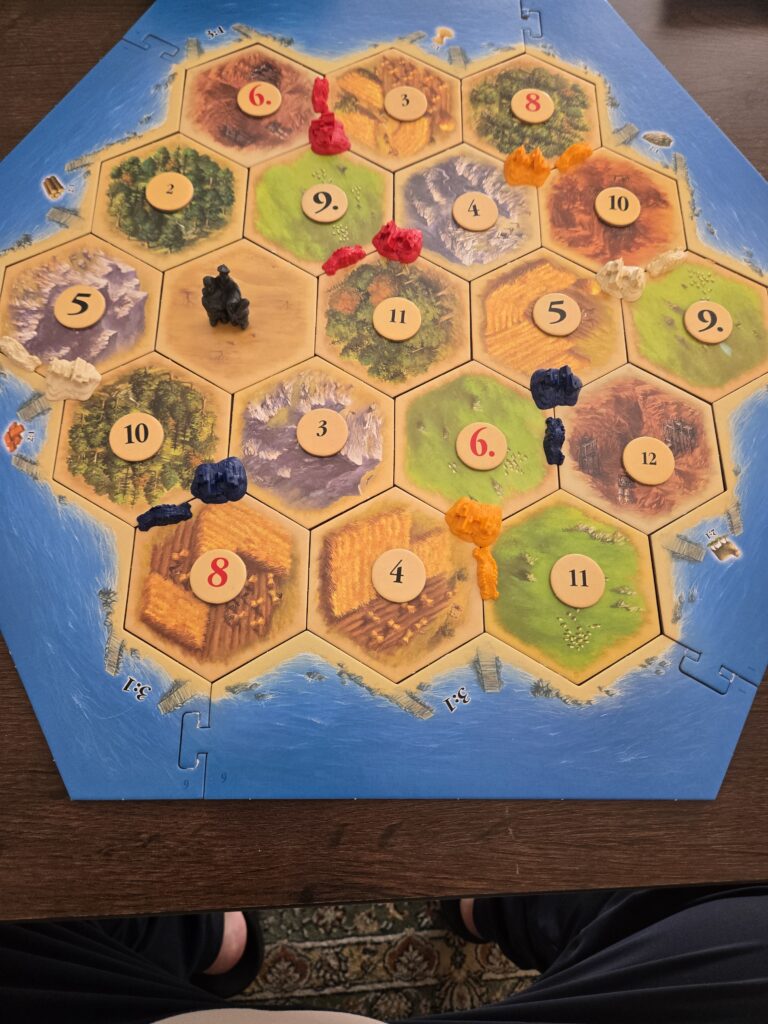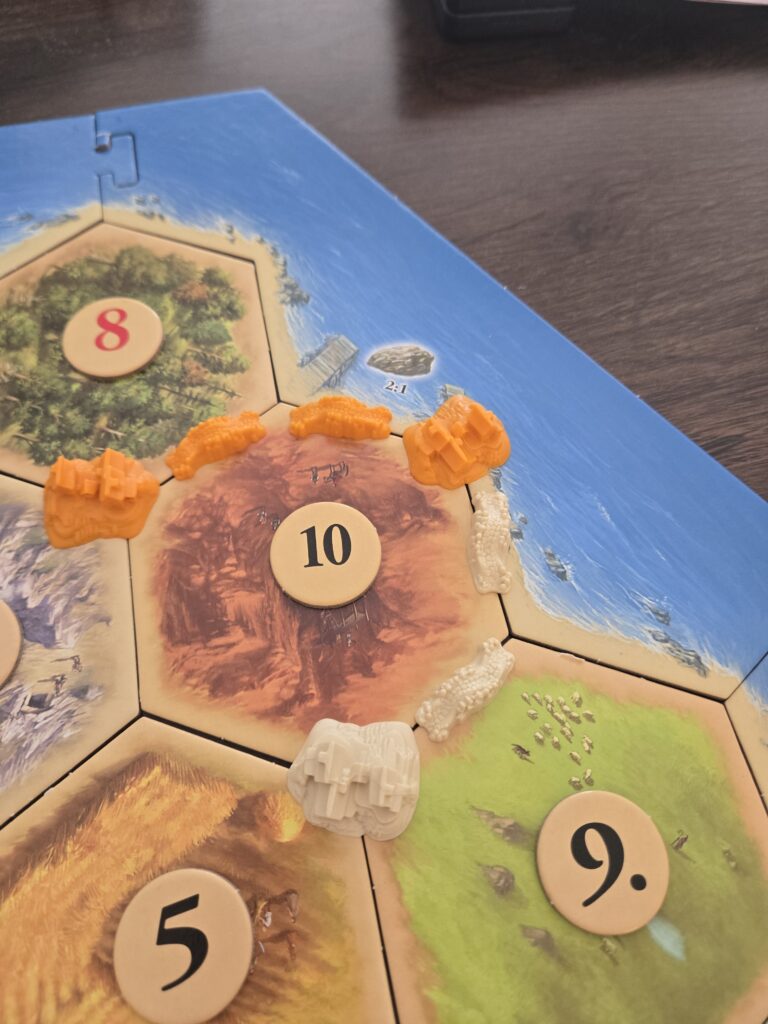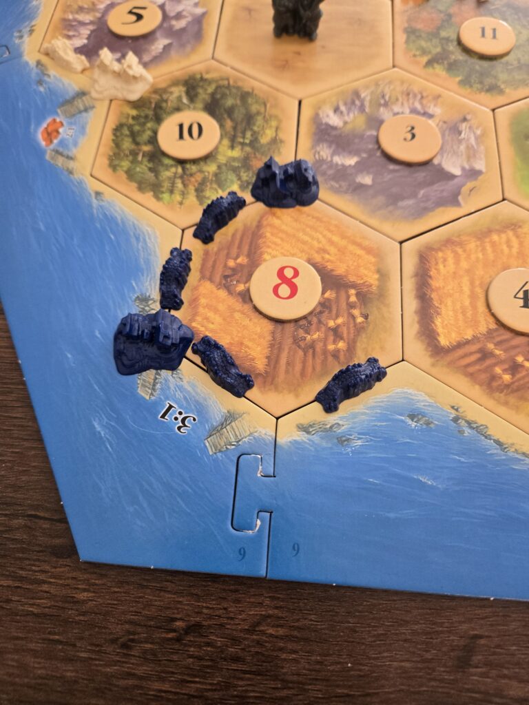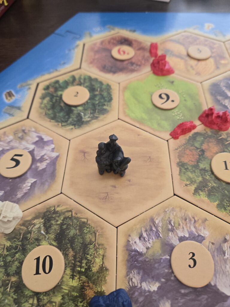 盗賊の置かれているタイルからは、ダイスで出目が出ても資源がもらえません。盗賊に奪われるって感じですね。上の画像で言えば、左下の10の木のタイルに盗賊がいるなら10出ても青と白のプレイヤーは木がもらえなくなります。これで他のプレイヤーの邪魔するって感じですね。最初のターンで7出て、相手のタイル封じて、木とかレンガとかもらうってことするとヘイトが向きますがそれも一興。