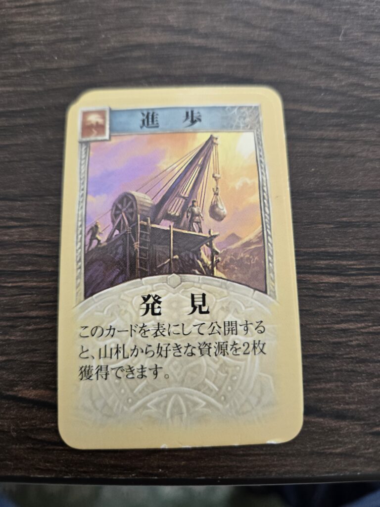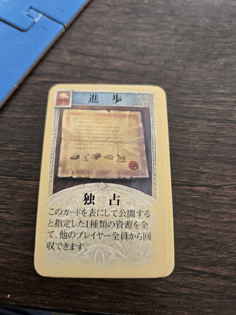 25枚のうち2枚が独占カードです。これめちゃくちゃ強くて、ダイス降って資源獲得したあとに使って今取った鉄よこしな!とかやれちゃったりします。