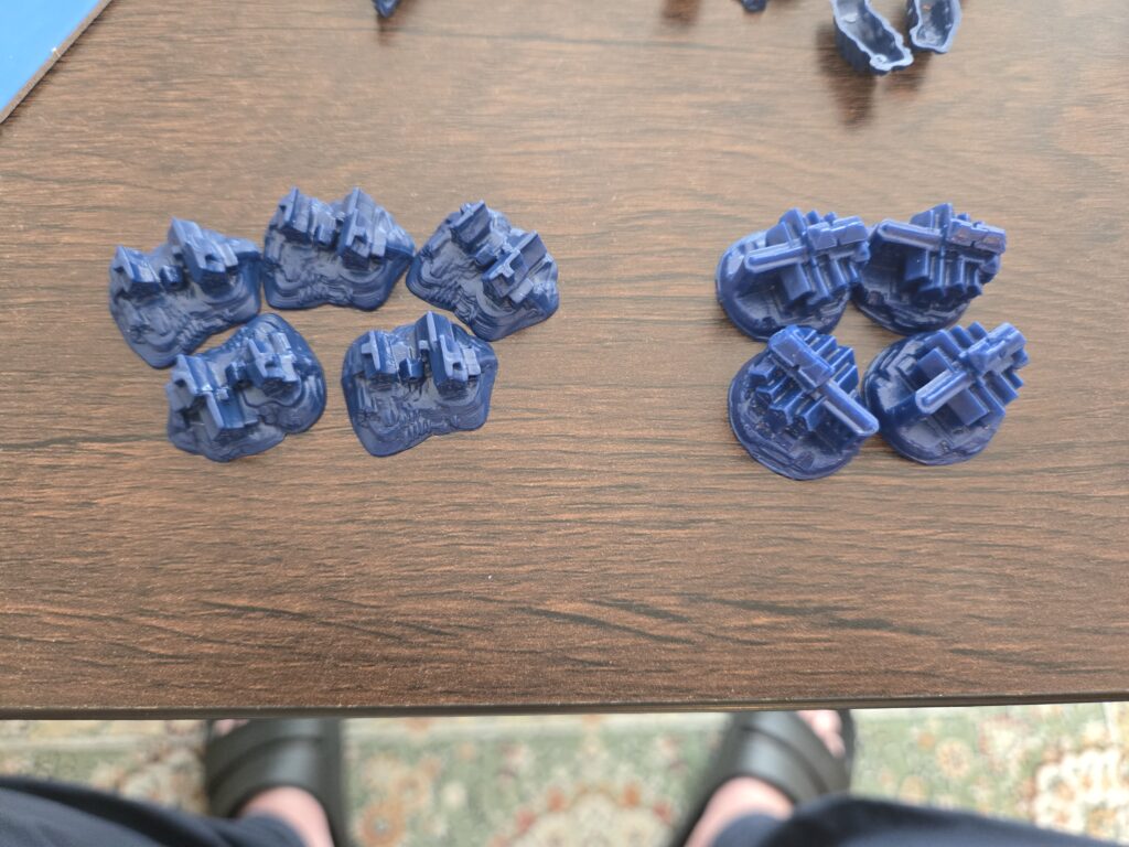 左のコマが開拓地(以降お家って言います)でこれを1個マップに置くと、1個につき1ポイント。右のコマが都市でこれをマップに置くと1個につき2ポイント。お家は5コマあって、都市は4コマあります。
