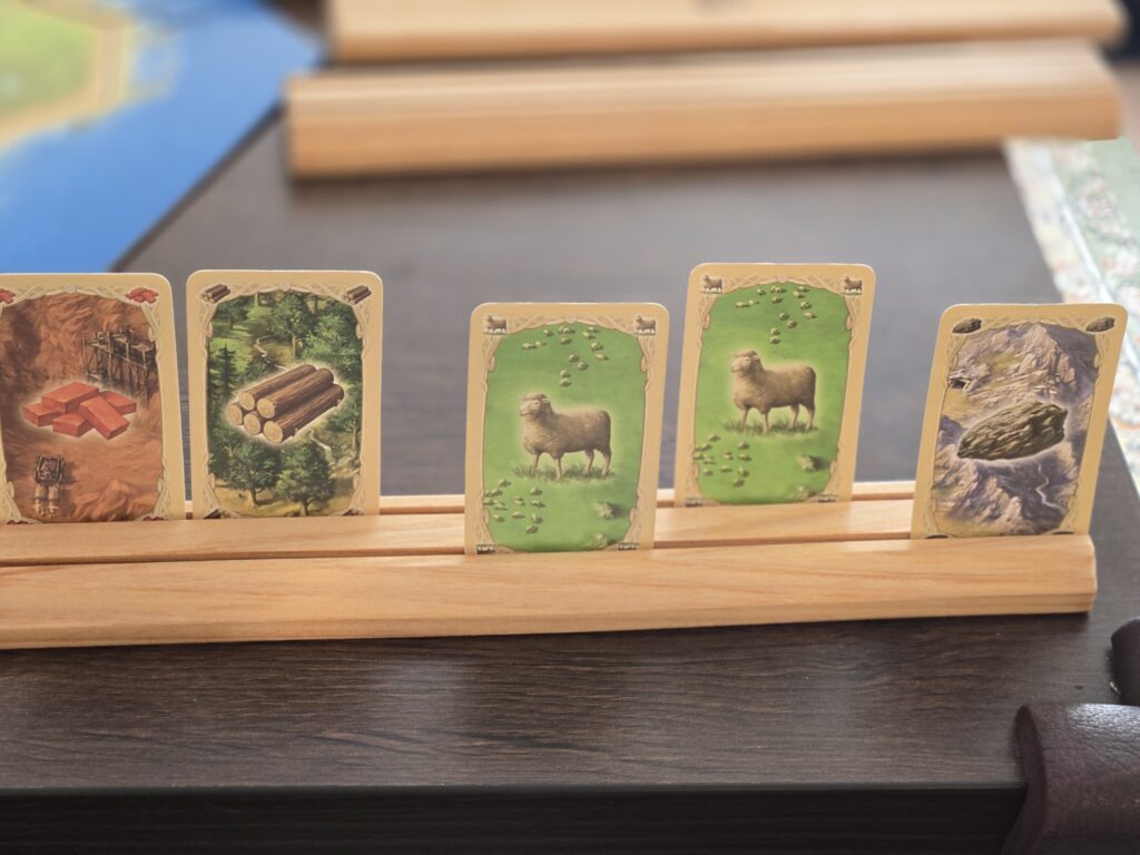 最初はカード表向きで置いてやっても良いんですが、誰が何持ってるかわからないから予測しながらやるってところや本当はその資源持ってるけど嘘つくとかも楽しみの1つなんで、カードスタンドがあると自分は見えてるけど他から見えないって状況が簡単に作れるんで便利です。自分が購入したのは↓のやつです。