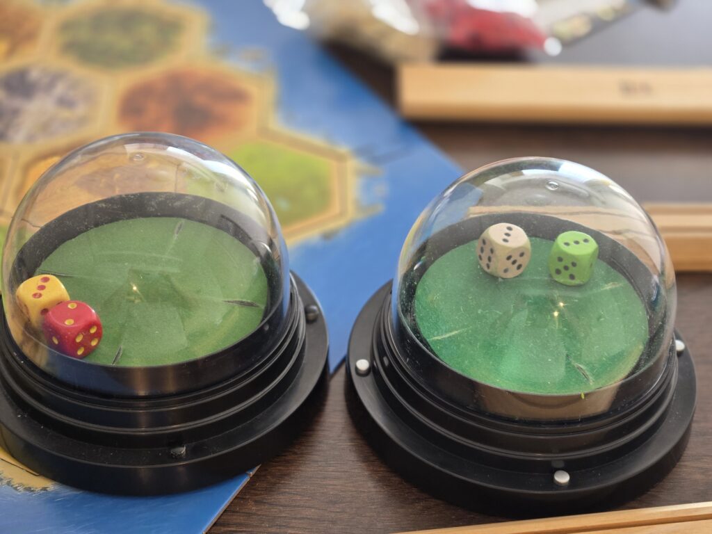 ダイスカップです。1個だと距離遠くて受け渡ししたり、腕伸ばさないとだめなんで2個買ってます。片方はカタンスタンダードのダイスで、もう片方はエネルギー版についてたダイスですが、ダイス自体は視認性高ければなんでも良いと思います。