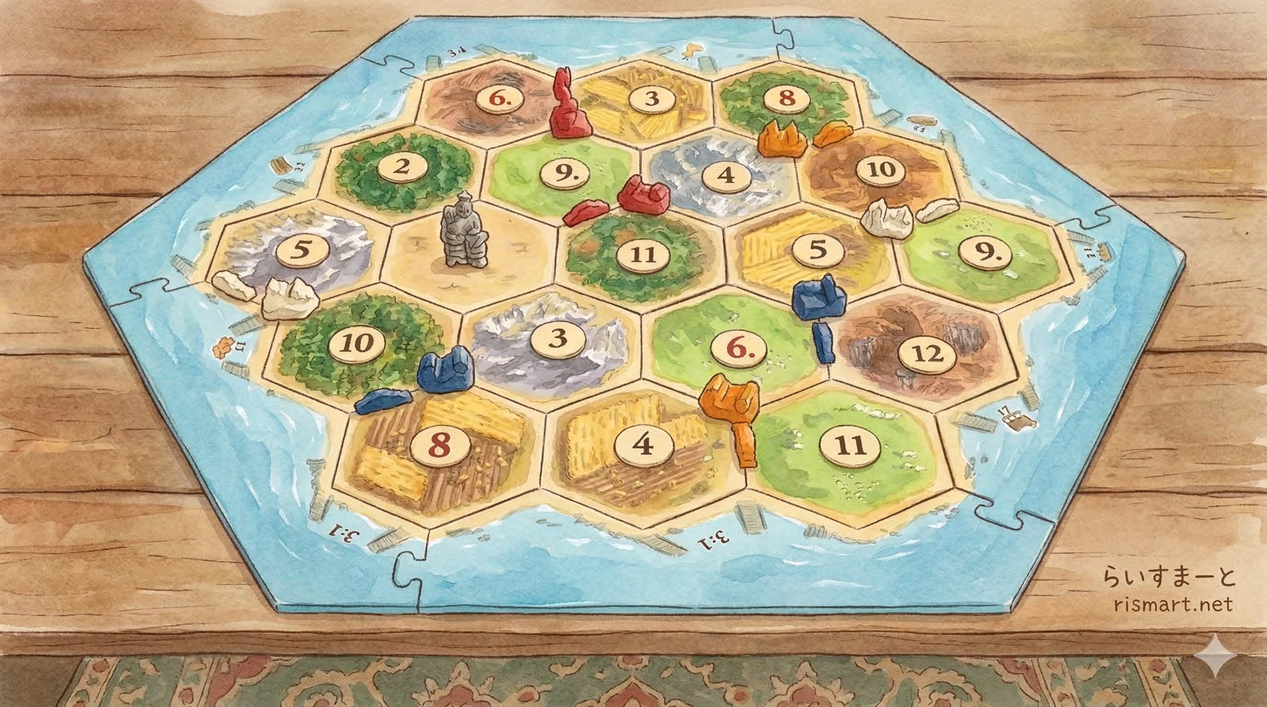 4人プレイヤーでやってるとしての初期配置終わりのイメージがこんな感じです。このタイルの種類が資源の種類を表してます。