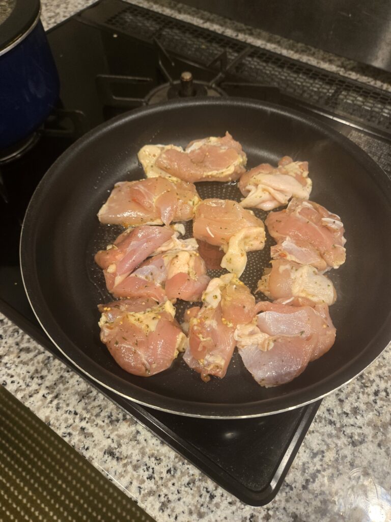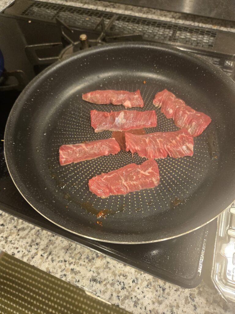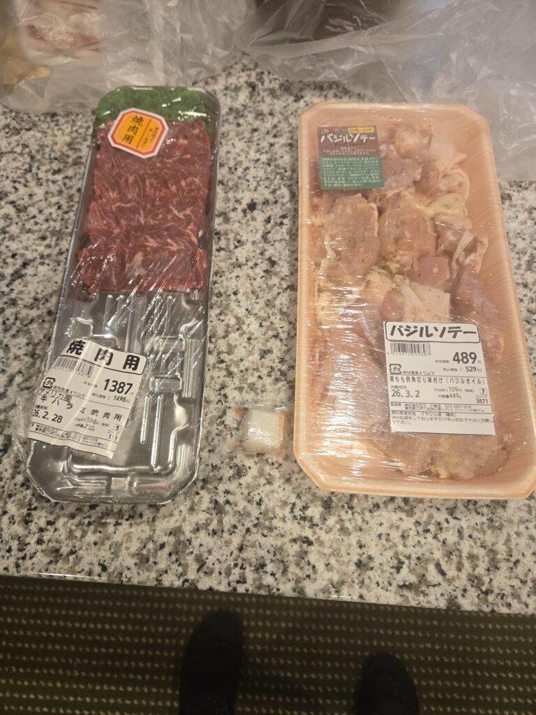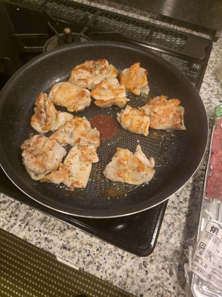 妻が前日にハラミを焼いて食べていて、それが残ってたんですがそれだけじゃ足りないよなってことでバジルソテーの味ついてる鶏肉を追加で買ってきました。鶏肉って安くてデカくて好き。