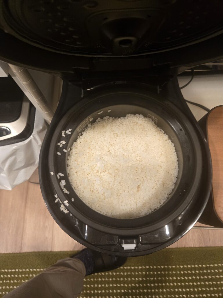 お肉も焼けたし、スープも作ったし、ご飯も炊いたし、さあ食べようと思ったんですが、お米洗ってそこから水いれずに炊飯してしまったようでご飯炊くのに失敗しました。これは料理酒ちょろりいれて水もっかい線まで入れて再度炊いたら食べられないことはないなってご飯にはなりました笑