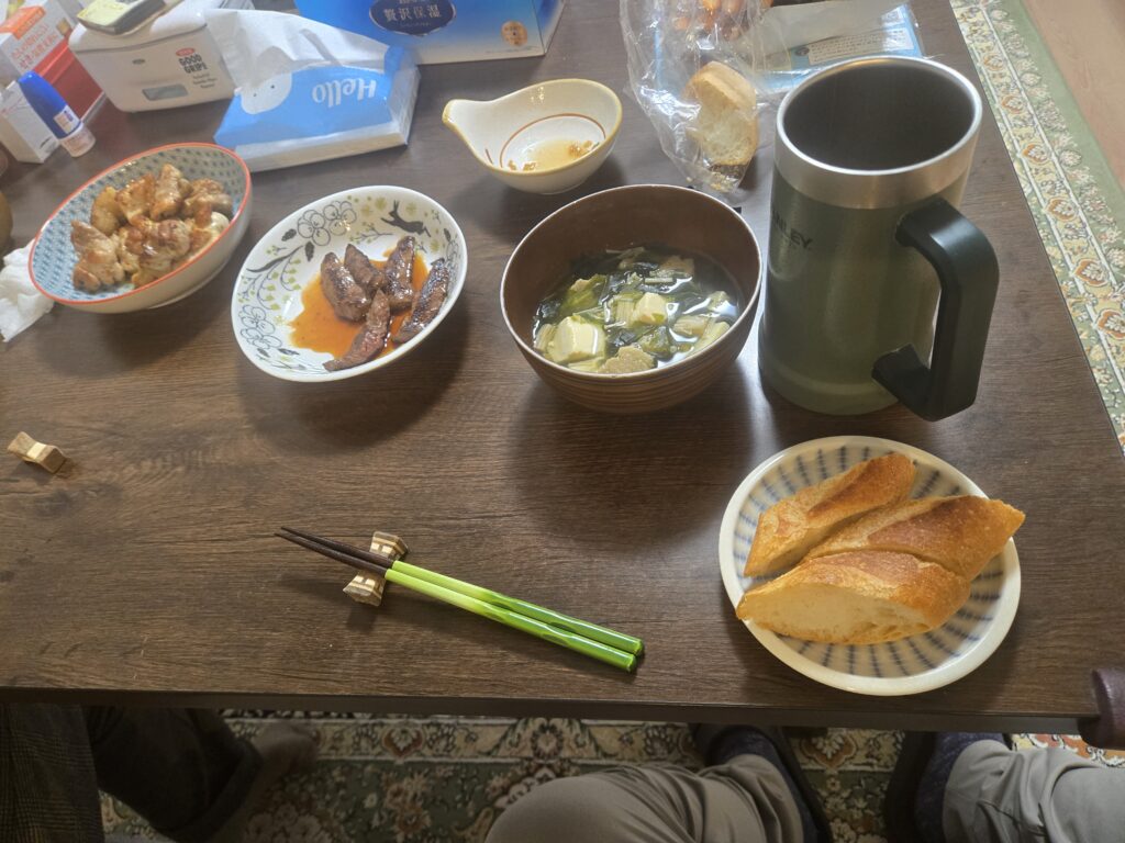 ハナマサで買ってきたお肉焼いたやつ、豆腐とわかめとえのきのスープ、あとご飯がわりのバケットです。バゲットはお肉と合って美味しかったです笑
