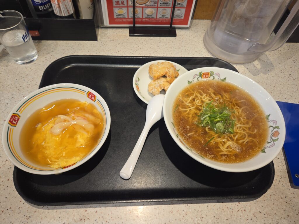 天津飯(自分は必ず京風ダレ)とかけラーメンと唐揚げのセットです。欲を言えばこれに餃子つけてくれると嬉しいんですけど懐に余裕があれば餃子も頼んじゃって良いかも。