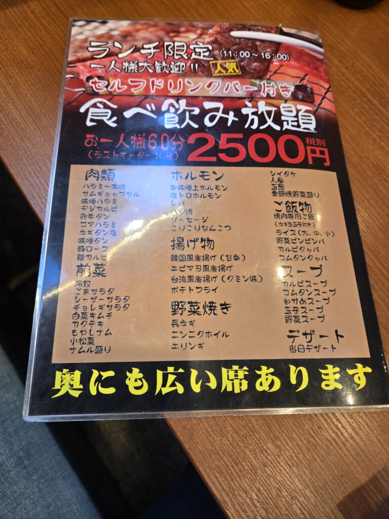 ランチでも夜でも食べ放題メニューがあって、ランチだと定食メニューもあります。なんですけど、自分が牛山道に行くときはほぼランチ食べ放題がお目当てです。ソフトドリンク飲み放題もついて税込で2750円です。まだ記事に書いてないんですけど、単純に価格で比べるならほるえもんのランチ食べ放題のほうが安いんですが、時間あたりに満足して食べられる量とかご飯もついてくるとか考えると、小岩のランチ焼肉食べ放題でコスパが一番良いのは牛山道だと思ってます。