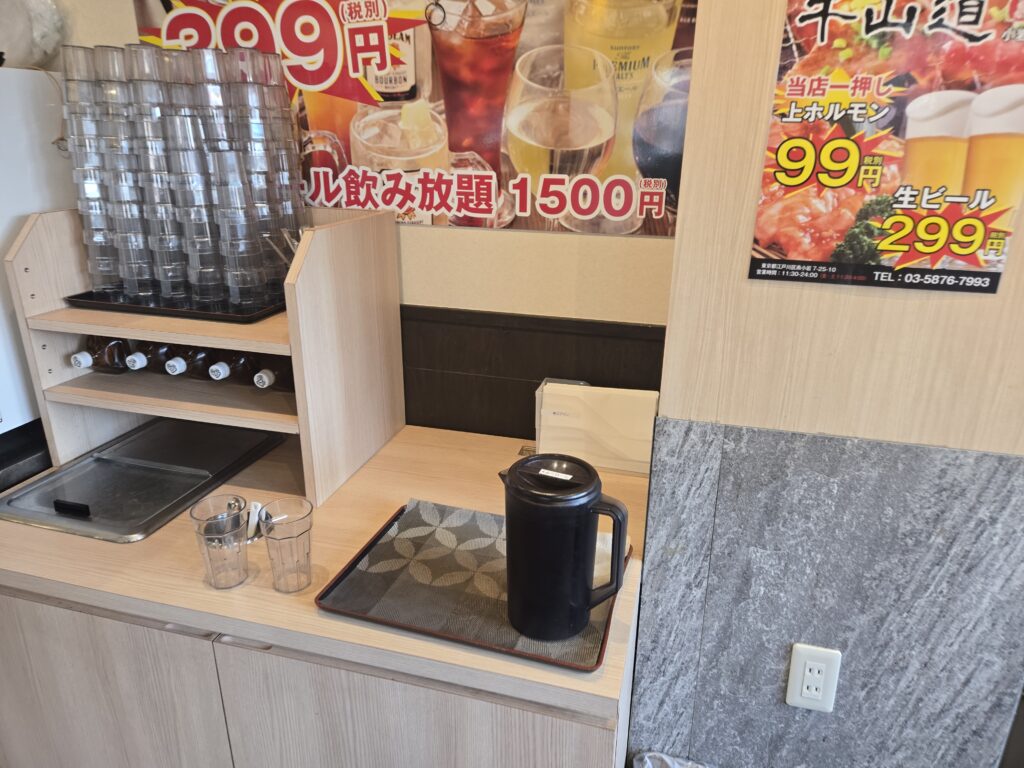 さっきのポットのやつに加えて機械式のドリンクバーもあります。デカビタがラインナップにあるのがとっても偉い。ただ、自分は焼肉食べ放題行っといて何を今更って言われるかもしれないんですが、糖質には多少気を使ってるので烏龍茶オンリーです。飲んでも最後に1杯だけにしてます笑