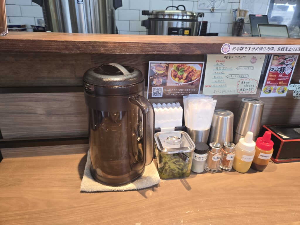店内はカウンターのみでした。卓上にお水や漬物に味変の調味料がたくさん並んでます。この漬物めっちゃ美味しかったです。お店で仕込んでるんですかね。どこかから買ってるなら買いたいくらいです。甘めな漬物でした。