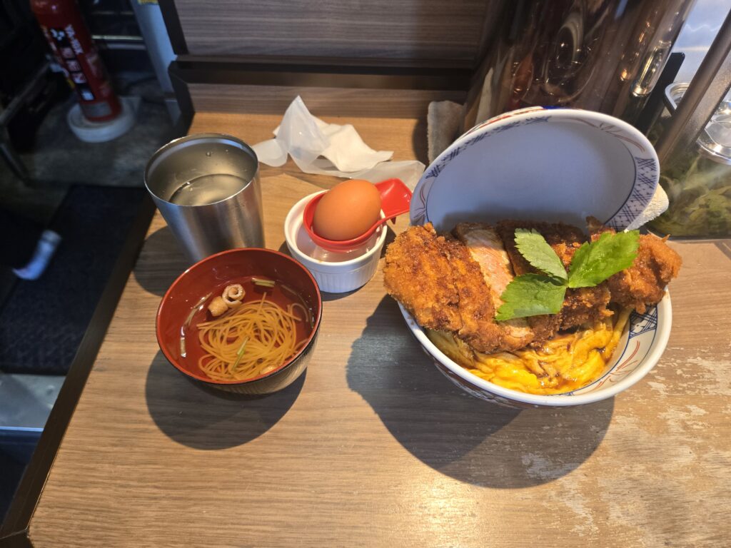 看板のとじないカツ丼の通常もあったんですが、せっかくだからと分厚い方にしてみました。卵はクーポンのやつでおすましがついてきました。