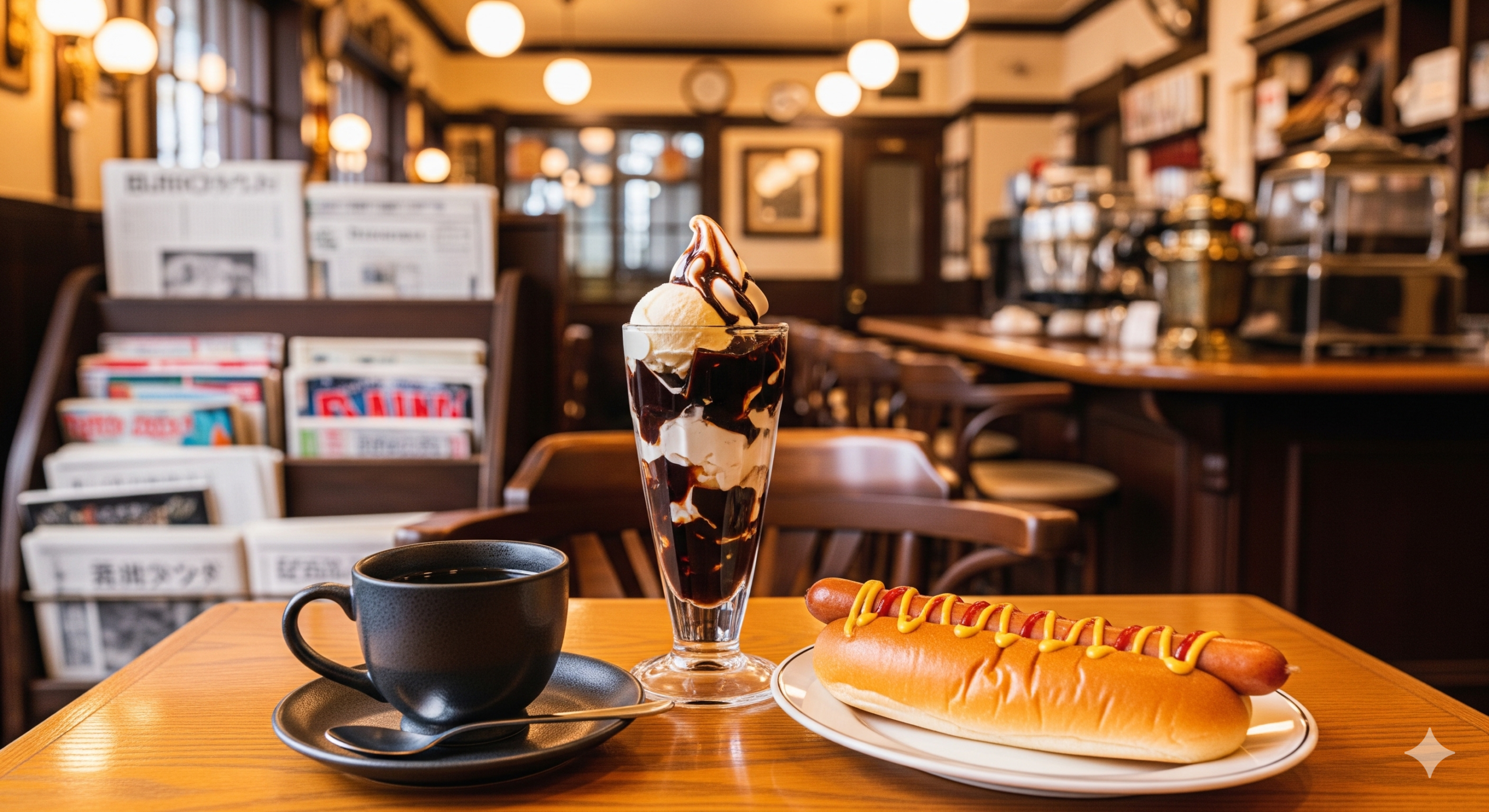 珈琲はもちろんのこと、焼いたサンドイッチ、ホットドッグ、パスタ、ホットケーキ、パフェなんかもある。