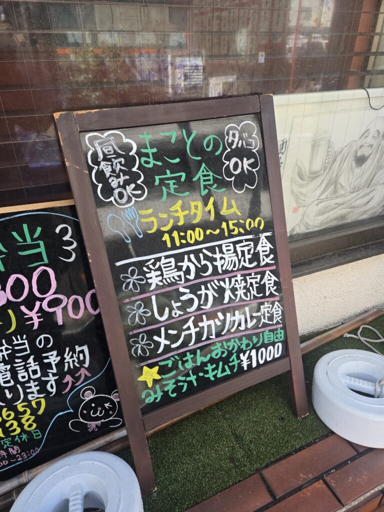 ランチメニューの看板が外に出てます。唐揚げと生姜焼きが食べたことあるんですけど、生姜焼きがご飯と合いすぎてもっぱら生姜焼きをオーダーしてます。