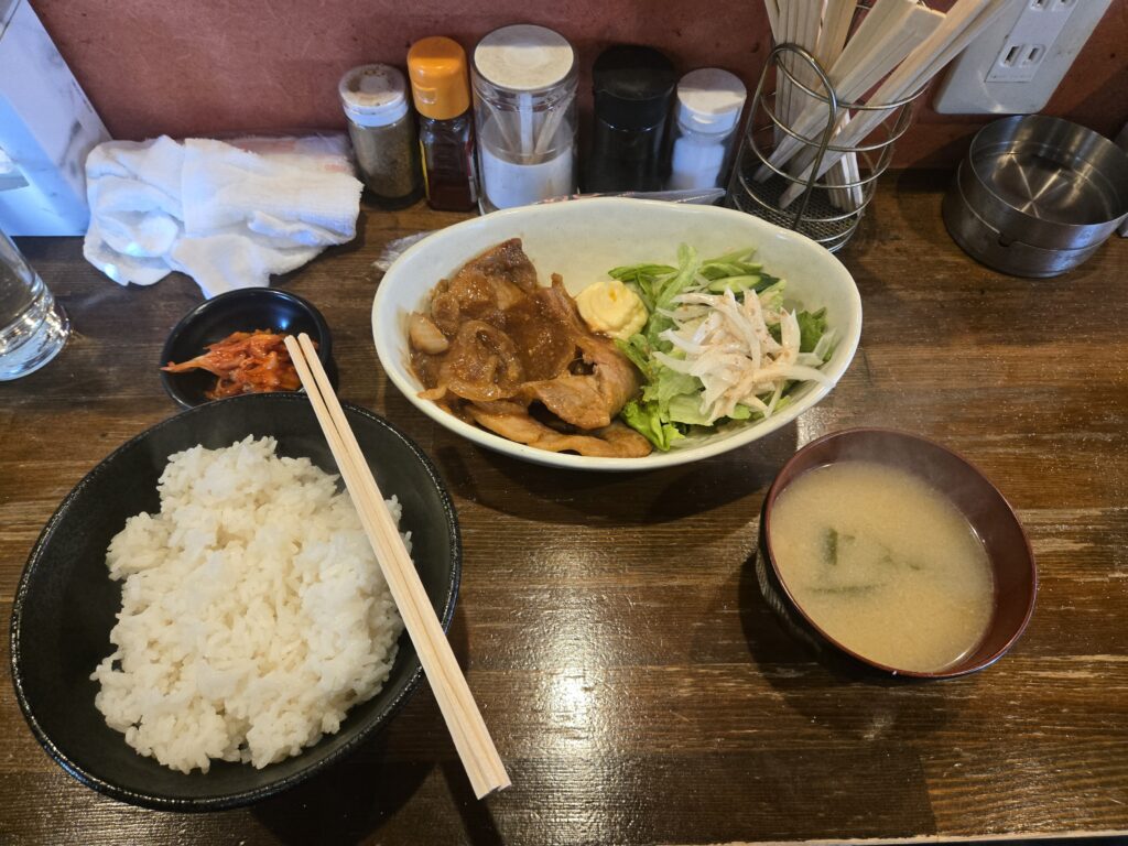 生姜焼き定食です。この生姜焼きがめっちゃご飯進むんですよ。タレ絡んだ玉ねぎでいけるくらいです。お米自体が値上がりしてるにも関わらず美味しいご飯をお代わり自由で提供してくれるのは本当にありがたい。付け合せのキムチも美味しいし、味噌汁も美味しいし、その気になればご飯3杯いけちゃうんですが、3杯食べると午後の眠気ばやばくなるので、2杯に抑えてます。ここランチは満足度高いです。