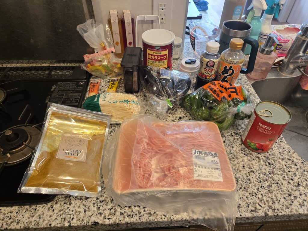 あとは調味料が、塩、生姜、にんにく、鶏ガラ、ウスターソース、めんつゆ、ナチュラル専科のカレー粉です。