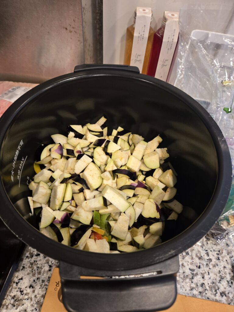 なすとえのきをざっくり細かめに切りましてホットクックに入れます。彩りが欲しいので冷凍のピーマンミックスも入れちゃいます。