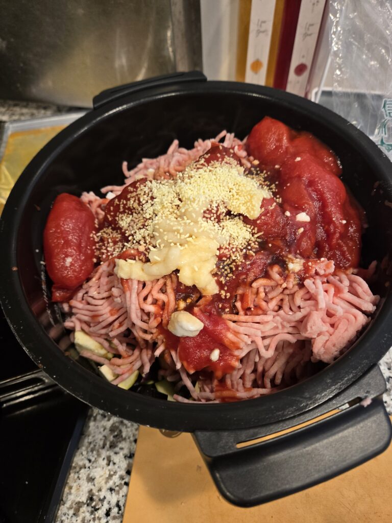 ひき肉もどーんと全部いれまして、ホールトマト缶、塩、鶏ガラ、ウスターソース、めんつゆ、にんにく、しょうがも入れます。味が薄い場合は大体塩が足りないんで、塩は自分で思ってるよりちょっと多めでもOKです。まあ、最後に足すでもいけます。