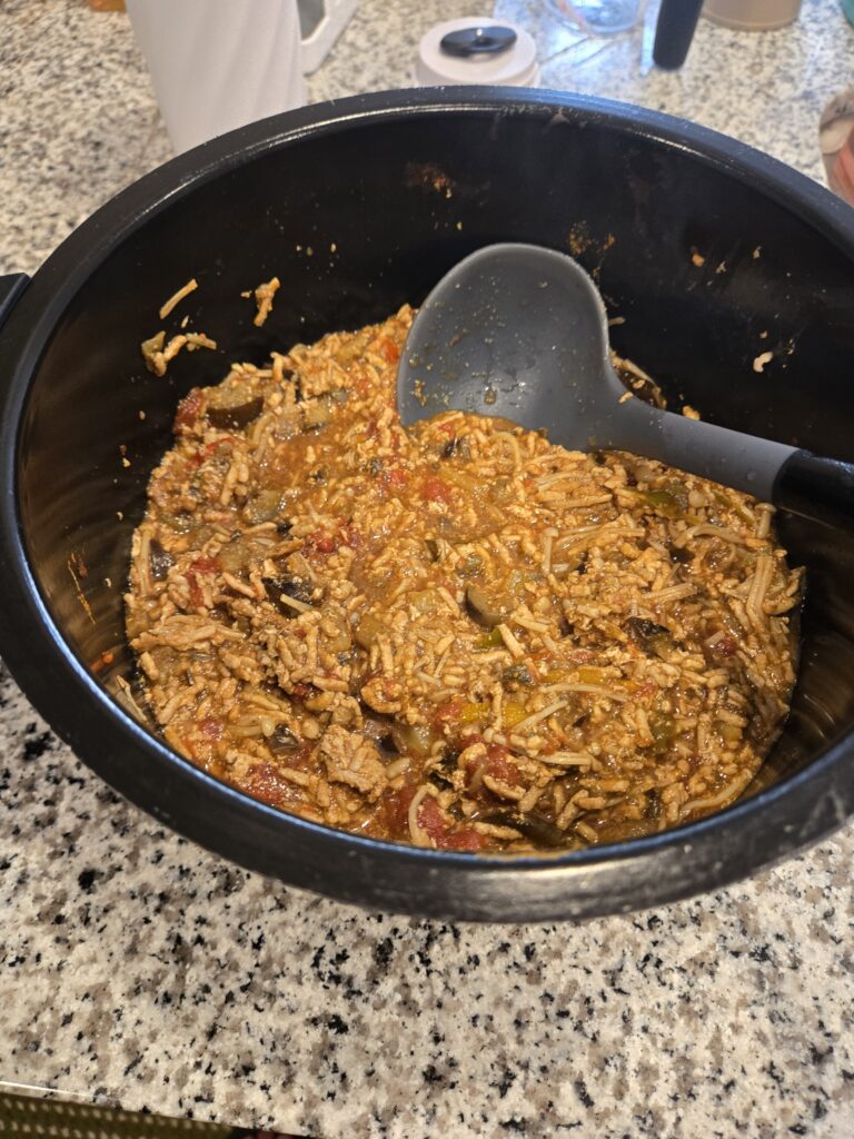 ちょっと線から出てたりするんですが、別に大丈夫です。平たくしといてもOKです。ちなみに私はホットクックのかき混ぜ棒は洗うのが面倒なのと、あれを使うにはスペースを開けなきゃいけなくてそれが嫌なので使ってません笑
