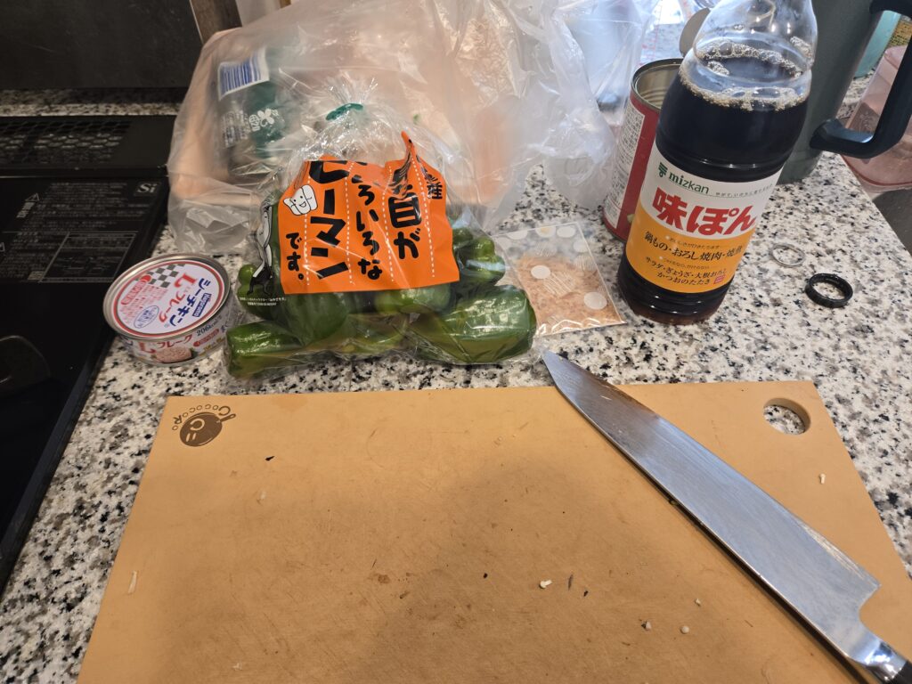 材料はピーマン、ツナ缶、かつおぶし、味ぽんの4つだけです。このレンジで作れるピーマンのやつは冷凍のピーマンだとふにゃっとなるので生のピーマンがおすすめです。大袋的なサイズのものを購入して一気に作ってます。