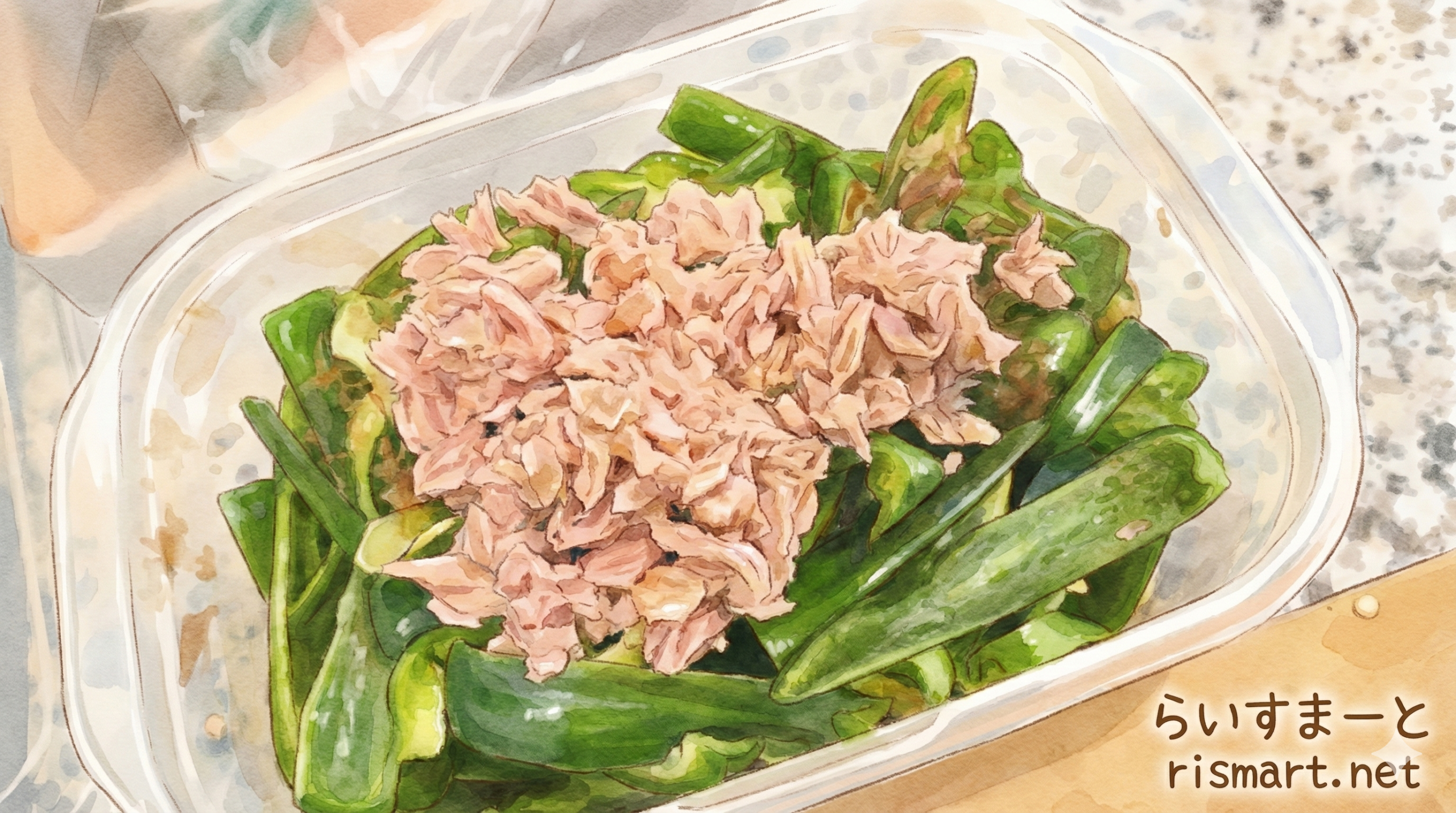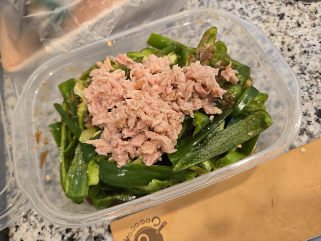 ツナ缶、かつおぶし、味ぽんを入れて混ぜたら完成です。自分は割とミチミチに作ってるんであれなんですがスカスカなら蓋を閉めてタッパーをシェイクしても楽だと思います。