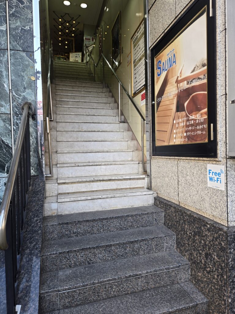 この階段を上ればフロントに着きます。結構この階段が辛い。ロッカーに靴を入れて靴箱の鍵を手に持ってフロントで手続きをします。