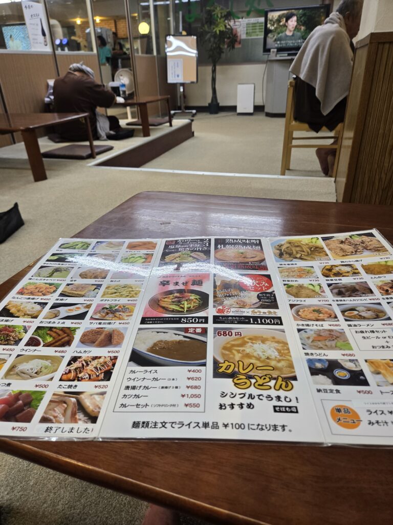 1個上にあがったら食事処や休憩ルームがあります。休憩ルームは割と暗めで寝るとかスマホ触る分には良いですが、漫画読むにはちょっと暗い感じです。
