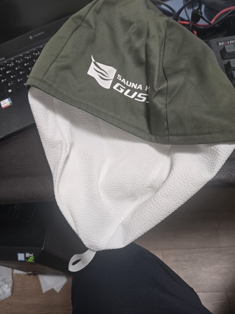 大体のサウナハットって頭の頂点に引っ掛ける輪っかがついてるんですが、これは内側をビロんとした中についてます。これのおかげなのか分かりませんが、サウナハットかけにかけてる間に蒸れが解放されてるのかななんて思ってます。