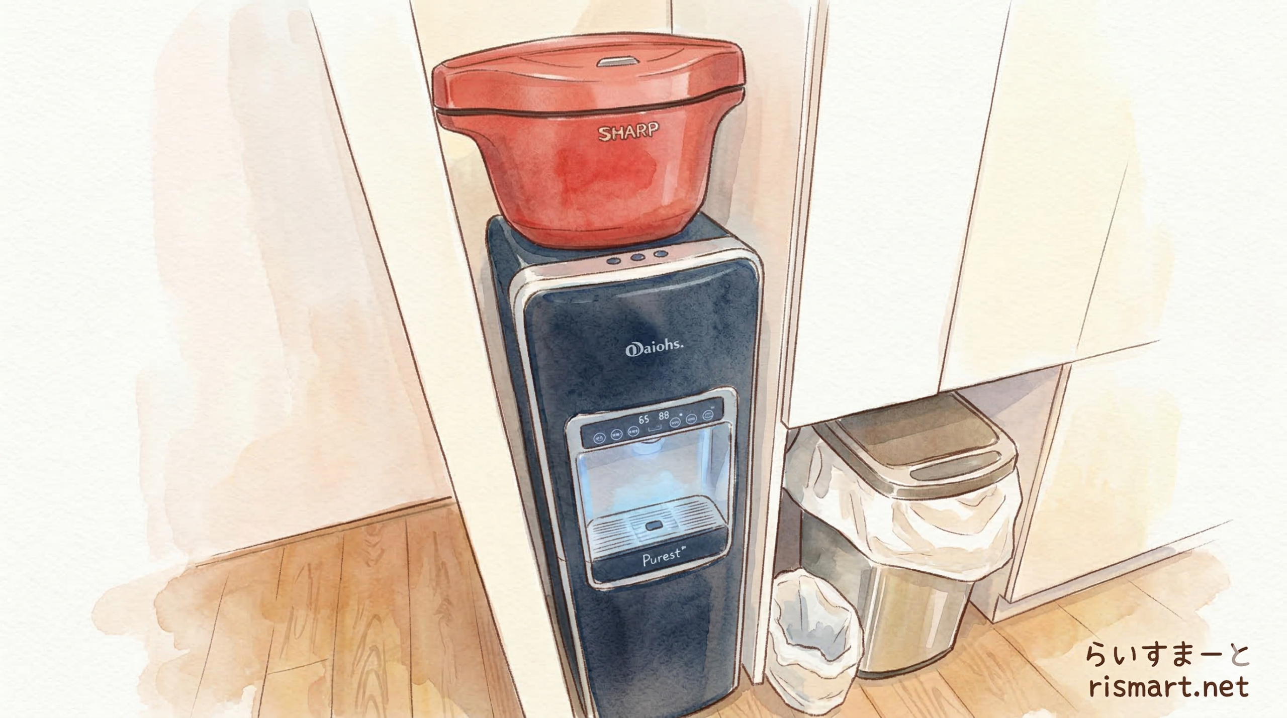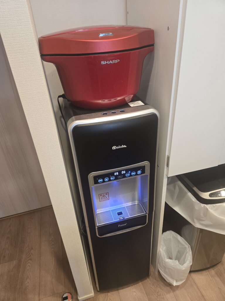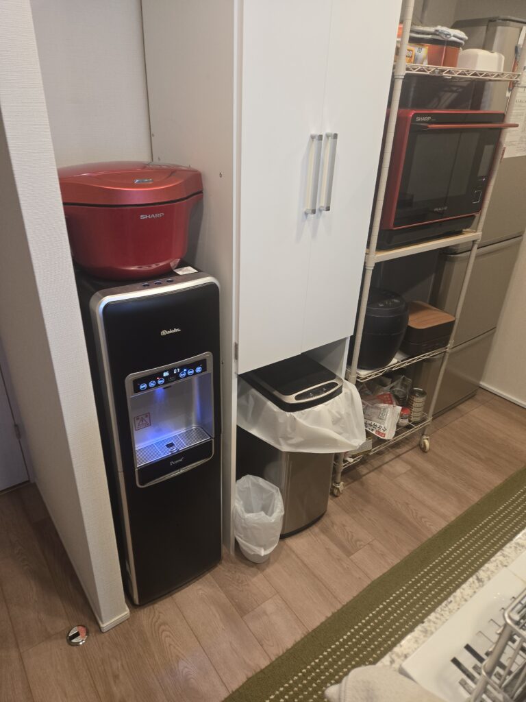 ウォーターサーバーの上においてるホットクックのほうが目立っちゃってそうですが、これが我が家にある楽水ウォータサーバーです。実態としてはダイオーズさんが出してるピュレストって機器を提供してます。(サーバ上部がフラットでホットクックなんかも置けますよ!もメリットとして捉えていただけると笑)