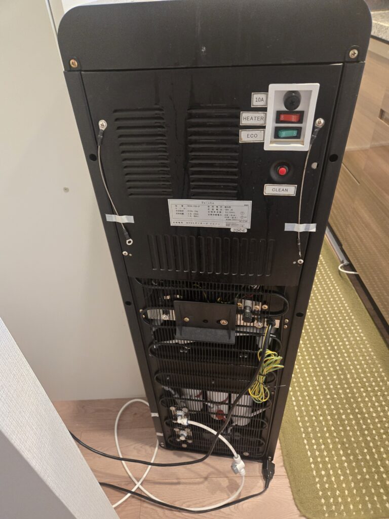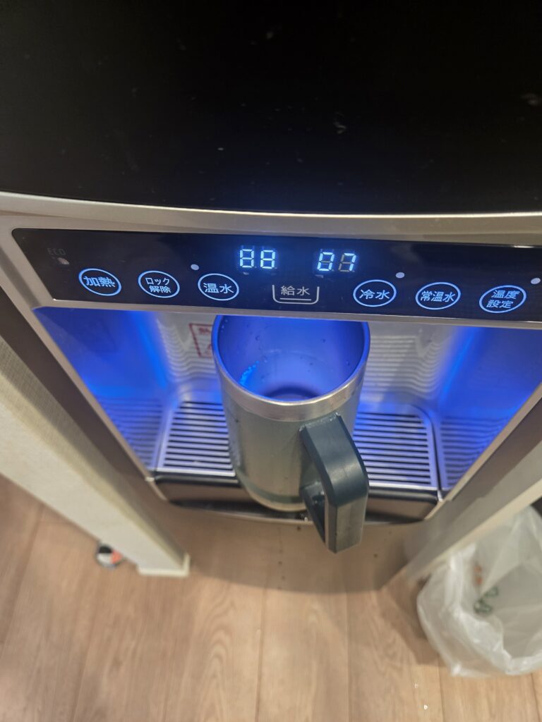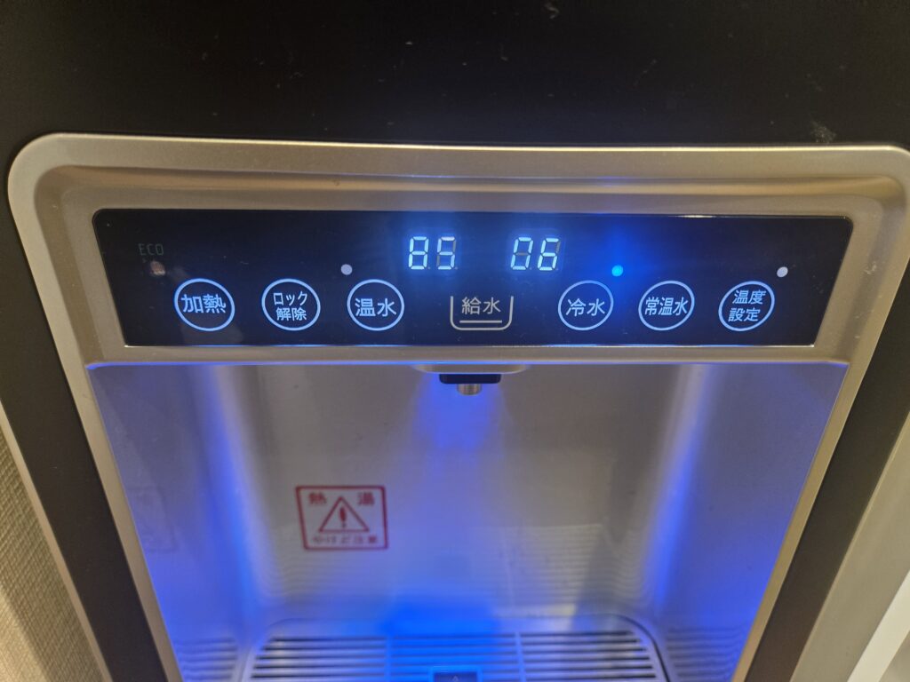 正面にパネルが合って押せば冷たい水なりお湯なり出てきます。でも、自分は上部パネルを基本的に使ってるのでこちらを使うのは加熱ボタン押すだけです。インスタントコーヒーとかはそのまま温水入れちゃうんですけど、写真撮った時はお湯の温度85℃になってますがどデフォだと90℃です。カップ麺とか作るときに、もうちょい熱くしたいなってときは加熱ボタン押せば95℃まであげられます。ちなみに内部の仕組み的には、冷水溜まるタンクとお湯溜まるタンクがそれぞれ分かれてる構造です。常温水を貯めとくタンクはないので、常温水おしたときは温水と冷水を混ぜた形で出てくる形です。