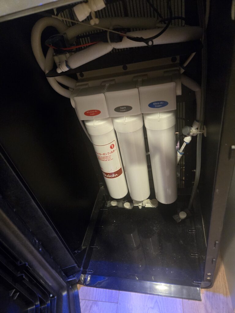 サーバ内部にフィルターが3つついてます。詳しいことは分かりませんが、この3本のフィルターを使って水道水を綺麗にして美味しくしてくれてるとのこと。このフィルターも種類によって交換時期が違うっぽいんですがだいたい半年に1回くらい、いずれかのフィルターが家に届くのでそれ付け替えるってことがメンテナンスとして必要なくらいです。