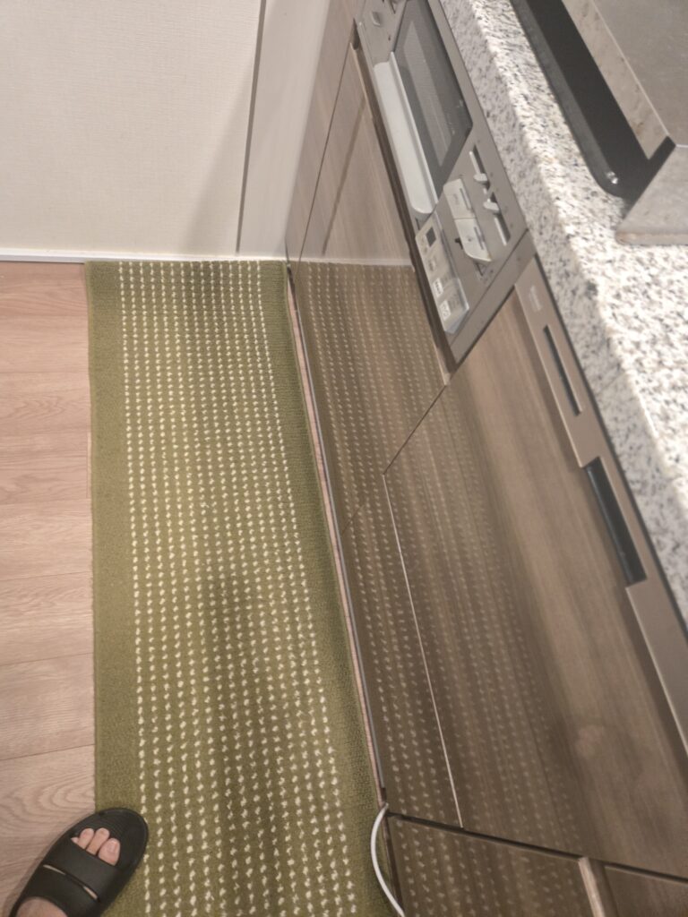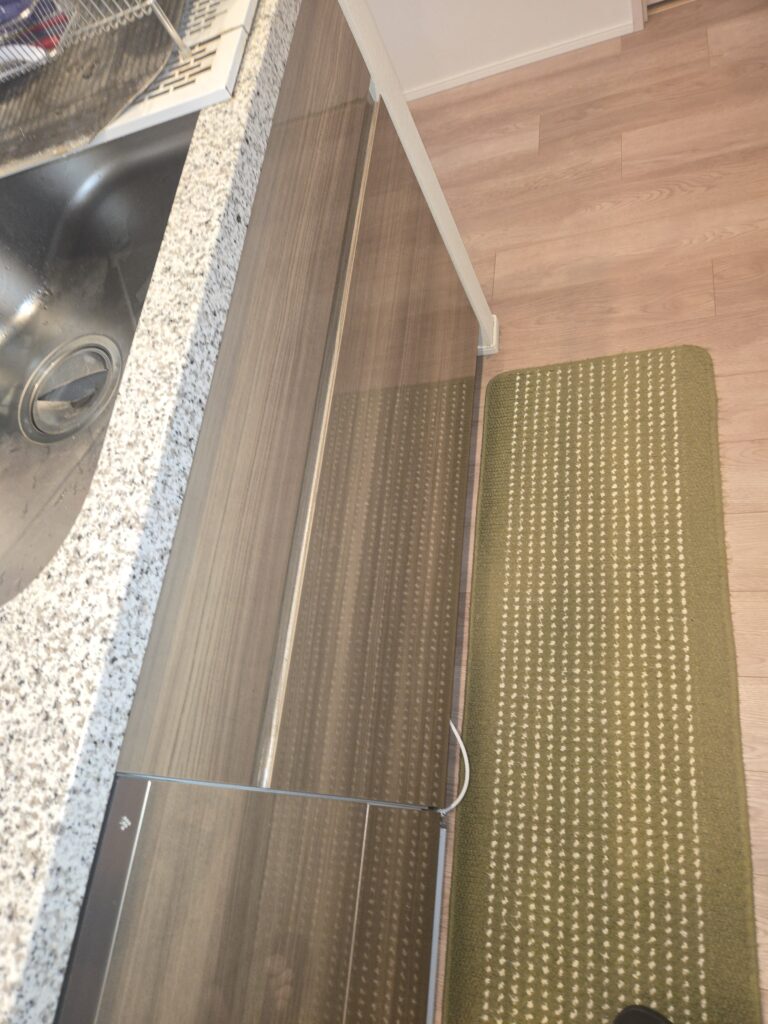 白いホースが出てまして、キッチンの奥の方に伸びてます。ちなみにこれがあっても干渉せずに引き出しはしまります。もしかしたらご自宅の作りによっては厳しいところもあるかもしれませんが。