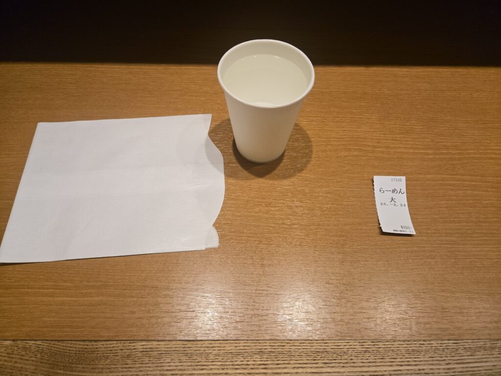 水はセルフサービス、紙エプロンもあります。