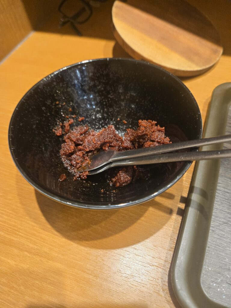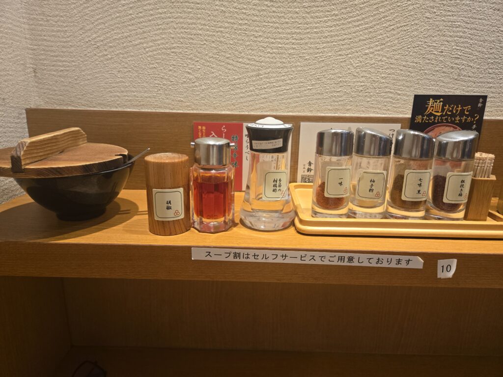 ラーメンにしてる理由がこの特性辛味です。割とラーメン屋で辛いの注文すると+100円くらい取られるところあると思うんですが、こちらの舎鈴はこの特製辛味が無料で使えます。つけ麺にもおすすめって書いてはあるんですけど、ラーメンのほうが合う気がしていてだから自分はラーメンにしてます。
