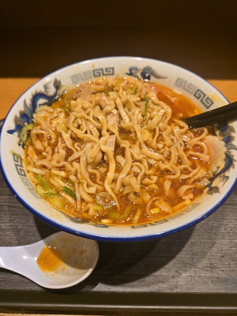 これが特製辛味を入れたラーメンです。しっかり辛くてめちゃくちゃ美味しい。小岩で辛いラーメン食べたいなら舎鈴で特製辛味入れたラーメンがおすすめです。
