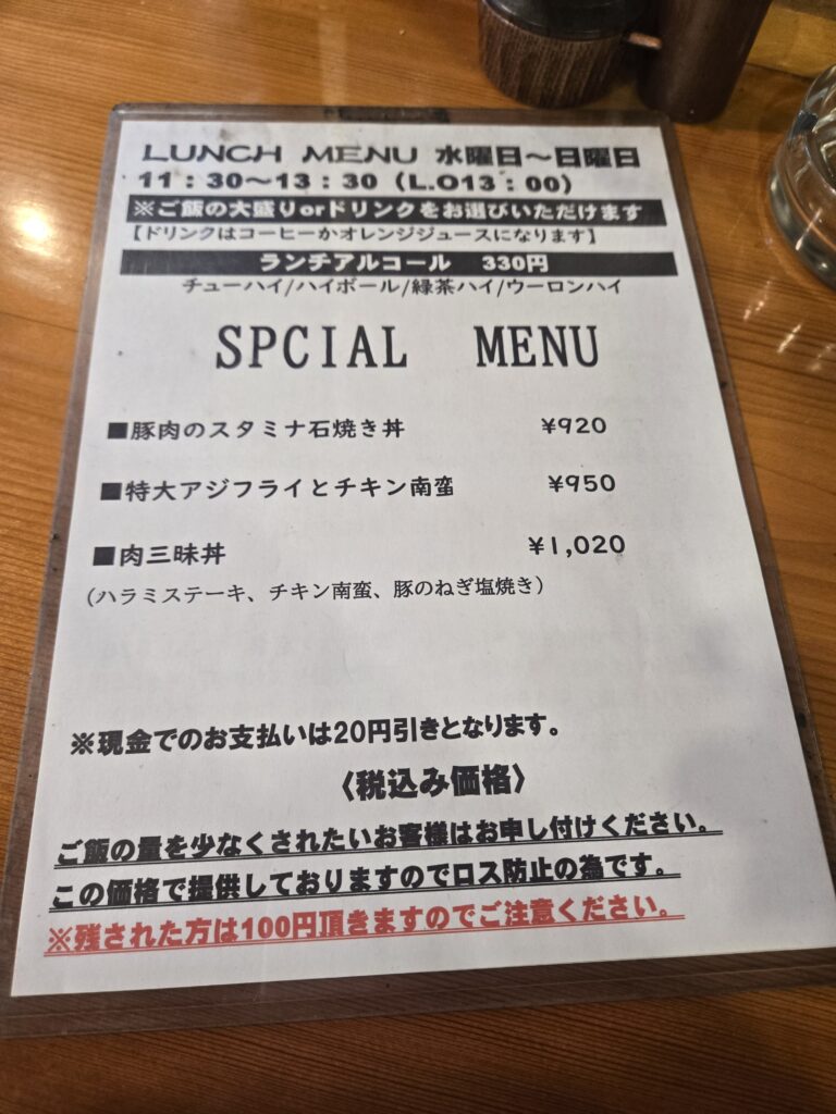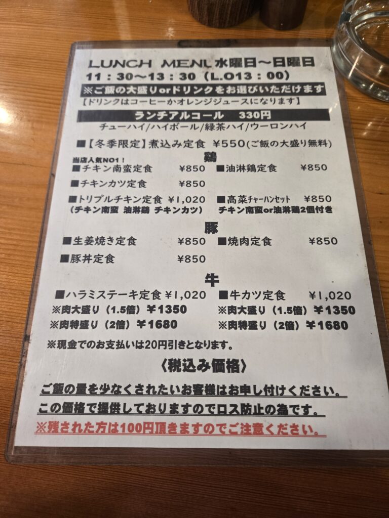 ランチメニューその1です。宮崎にルーツがあるからかチキン南蛮推しになってます。ご飯の大盛りかドリンク1杯サービスも嬉しいですし、そもそも価格がお安めではあります。現金で払えば大体1000円あれば足ります。